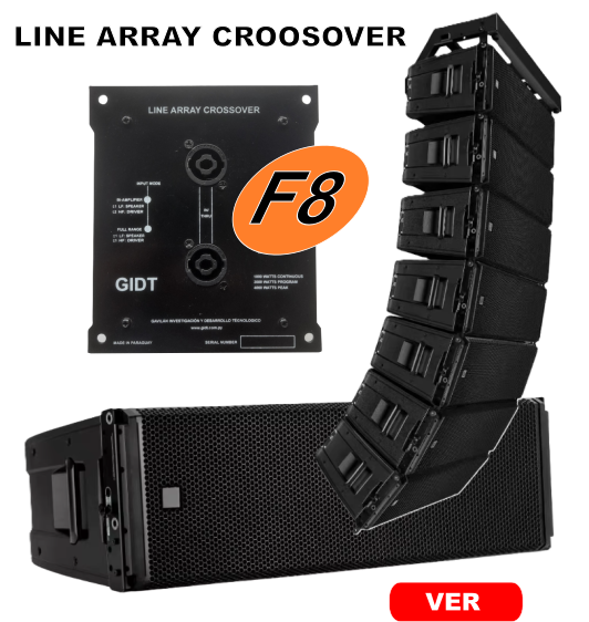 Line Array Crossover F8 configuración en modo Bi-Amp o Full Range, selector de cortes de frecuencia, salida By-Pass para parlantes F8, potencia duplicada en F4 para el driver y salida directa para complementos auxiliares